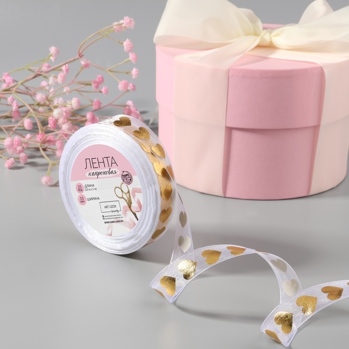 Лента капроновая с тиснением «Сердца», 15 мм, 23 ± 1 м, цвет белый/золотой