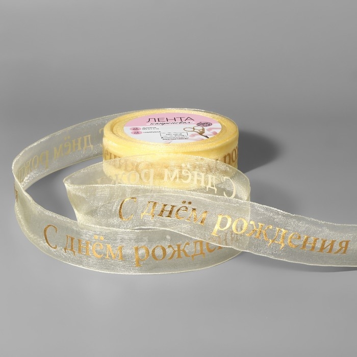 Лента капроновая с тиснением «С Днём рождения», 25 мм, 22 ± 1 м, цвет бежевый/золотой