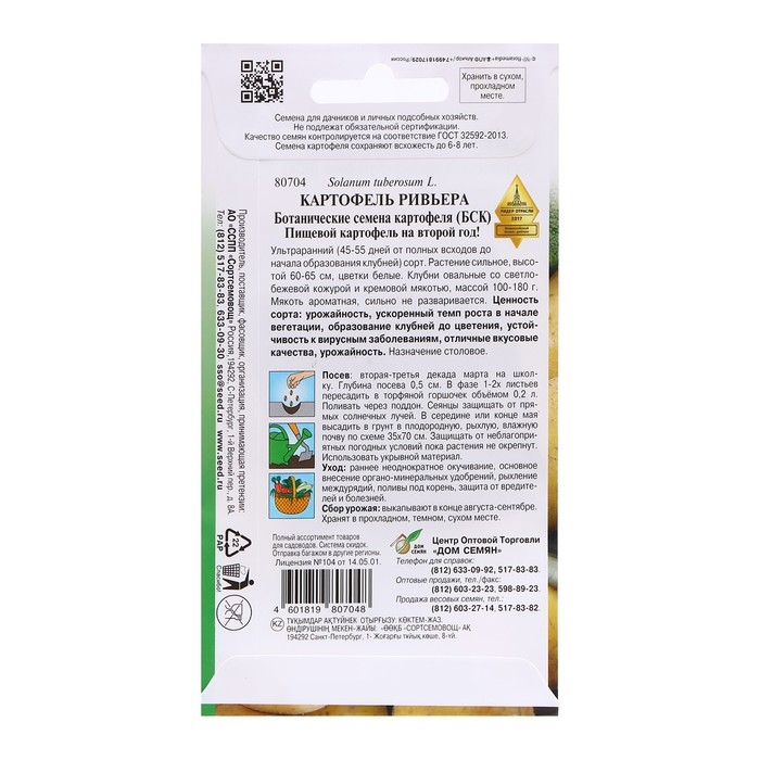 Семена картофель Ривьера. Раннеспелый сорт столового назначения. Клубни овальные, массой 101-177 г, с мелкими глазками, кожура светло-бежевая, мякоть кремовая. Сорт характеризуется очень высокой товарностью и лежкостью клубней, устойчив к возбудителю рака картофеля, золотистой картофельной цистообразующей нематоде, полосчатой мозаике. Корнеплоды имеют превосходный вкус, хороши как в жареном, так и в отварном виде.