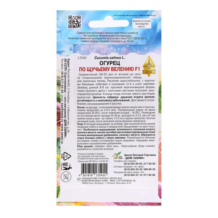 Среднеранний (50-52 дня) партенокарпический гибрид женского типа цветения, не требующий опыления. Способен одарить сказочными урожаями при минимальных трудозатратах. Важная особенность сорта - компактный куст, не нуждающийся в формировании (прищипке) + длительный (до наступления заморозков) период плодоношения. Растение одностебельное, не требует формирования, с пучковым образованием завязей. Зеленец цилиндрический, крупнобугорчатый, темно-зеленый, длиной 10-12 см, массой 100- 120 г. Назначение универсальное. Ценность гибрида: высокая урожайность, холодостойкость, длительный период плодоношения, отличные вкусовые качества, устойчивость к болезням. Предназначен для выращивания под пленочными укрытиями. Для получения 2-го урожая, начиная с августа, провести 2-3 внекорневых подкормки комплексным минеральным удобрением.