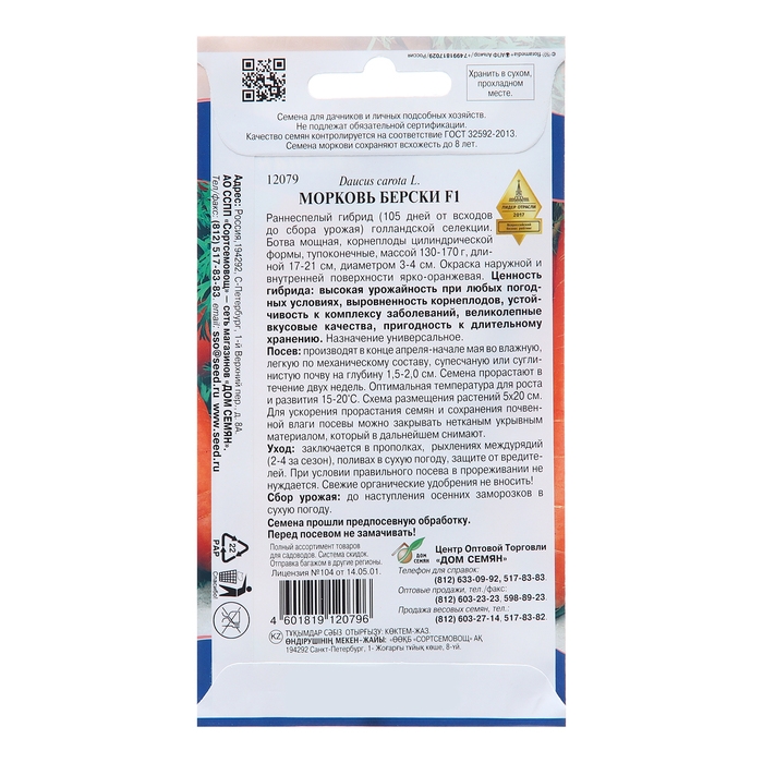 Новейший гибрид голландской селекции. Лучший по урожайности, внешнему виду и вкусовым качествам. Созревает за 105 дней от всходов. Ботва мощная, ярко-зеленая, корнеплоды цилиндрической формы, тупоконечные при полном вызревании, массой 130-170 г, длиной 17-21 см, диаметром 3-4 см. Окраска наружной и внутренней поверхности вместе с сердцевиной ярко-оранжевая. Ценность гибрида заключается в высокой урожайности при любых погодных условиях, выровненно-сти корнеплодов, устойчивости к комплексу заболеваний и великолепном вкусе. Гибрид отлично хранится до весны. Использование универсальное.Посев производят в конце апреля -начале мая. Сеют в увлажненные бороздки , на глубину 1-1,5 см. Для получения ранней продукции грядку прогревают, накрыв ее за 7-10 дн. до посева пленкой или лутрасилом, которые оставляют до появления всходов. Почва должна быть легкой по механическому составу, с глубоким пахотным слоем, супесчаной или суглинистой. Уход заключается в, прополках, рыхлениях междурядий, 2-4 за сезон, поливах в сухую погоду,защите от вредителей. Особое, внимание необходимо обращать на своевременное и качественное прореживание на 5-6 см в ряду. Свежие органические удобрения не вносить!Сбор урожая проводят в середине сентября, в сухую погоду. Урожайность 8-9 кг/м2.Семена обработаны фунгицидами, противогрибковыми препаратами. Перед посевом не замачивать!