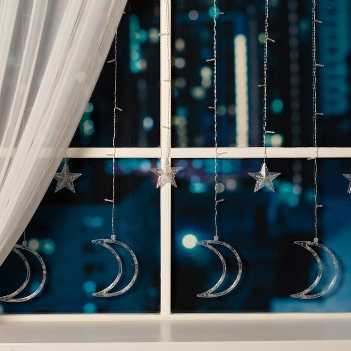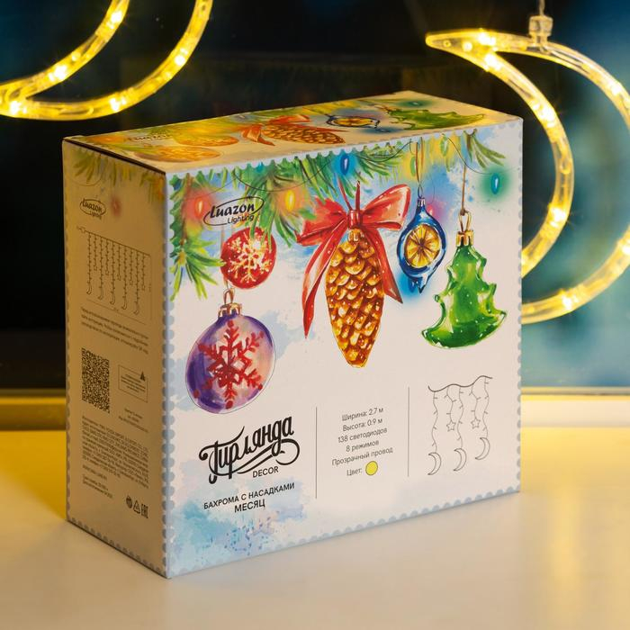 Гирлянда «Бахрома» 2.7 × 0.9 м с насадками «Месяц», IP20, прозрачная нить, 138 LED, свечение тёплое белое, 8 режимов, 220 В