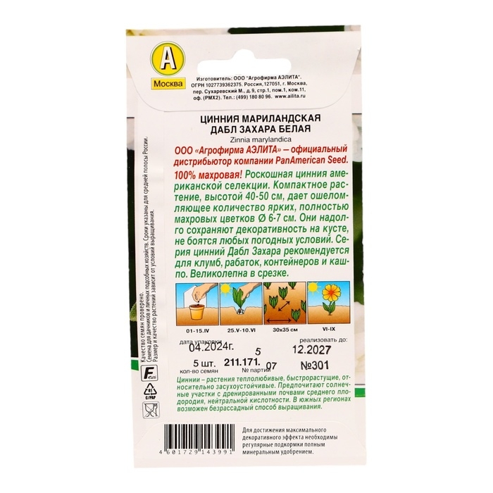 Семена Цинния Дабл Захара белая Одн Сел. PanAmerican Ц/П 5шт