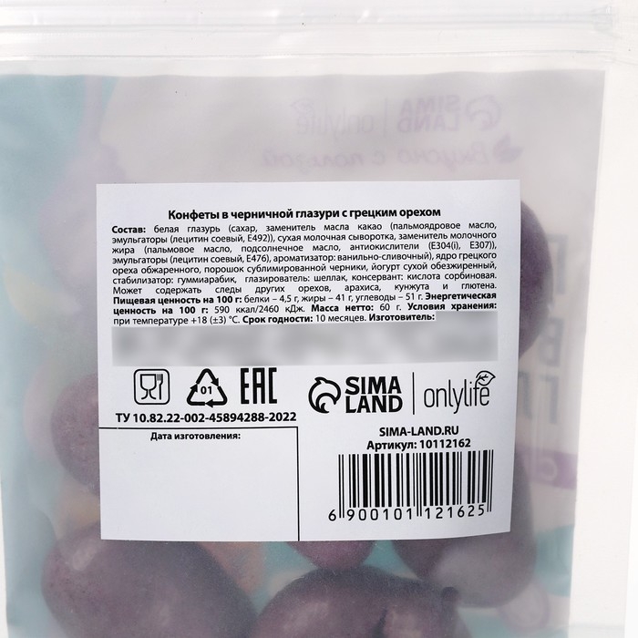 Состав: белая шоколадная глазурь (сахар, какао-масла эквивалент (смесь растительных масел), молоко сухое обезжиренное, какао-масло, сыворотка сухая молочная, эмульгаторы (лецитин соевый, Е476), ароматизаторы), ядро грецкого ореха обжаренного, порошок сублимированной черники, черника сушёная, йогурт сухой обезжиренный, стабилизатор – гуммиарабик, краситель пищевой натуральный – кармин, глазирователь – шеллак, регулятор кислотности – лимонная кислота.