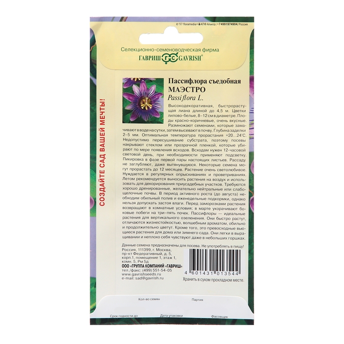 Высокодекоративная, быстрорастущая лиана длиной до 4,5 м. Цветки лилово-белые, 8-12 см в диаметре. Плоды красно-коричневые, очень вкусные. Растение очень светолюбивое. Нуждается в регулярных опрыскиваниях и проветриваниях. Пассифлоры — идеальные растения для вертикального озеленения. Они быстро растут, отличаются жизнестойкостью, волшебным ароматом, обильно и продолжительно цветут. Кроме того, это превосходные вьющиеся растения для дома или зимнего сада. Они легки в выращивании и неплохо себя чувствуют даже в небольших горшках.
