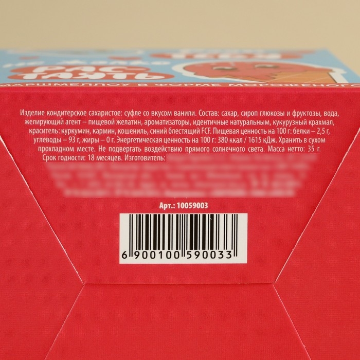 Состав: сахар, сироп глюкозы и фруктозы, вода, желирующий агент - пищевой желатин, ароматизатор , идентичный натуральным, кукурузный крахмал, краситель: куркумин, кармин, кошениль, синий блестящий FCF.