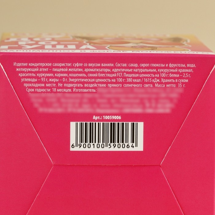 Состав: сахар, сироп глюкозы и фруктозы, вода, желирующий агент - пищевой желатин, ароматизатор , идентичный натуральным, кукурузный крахмал, краситель: куркумин, кармин, кошениль, синий блестящий FCF.