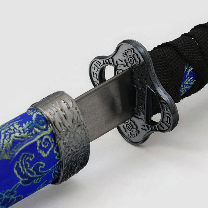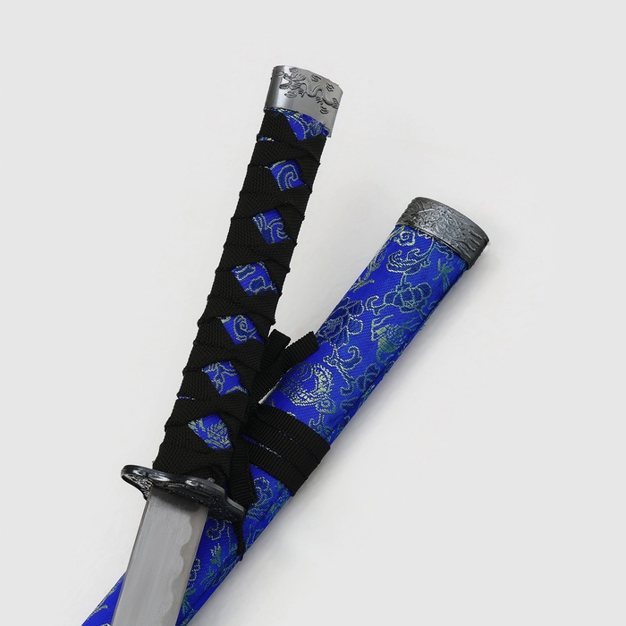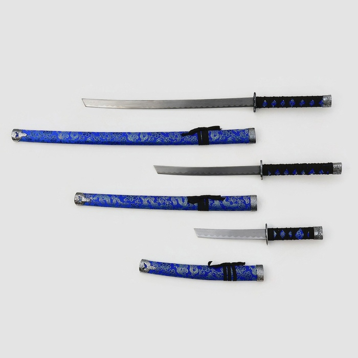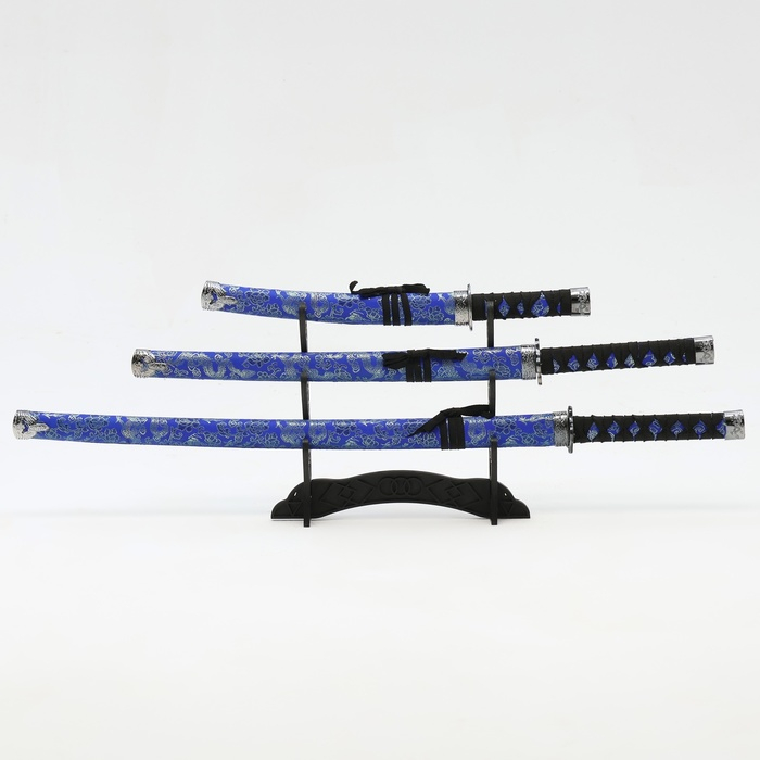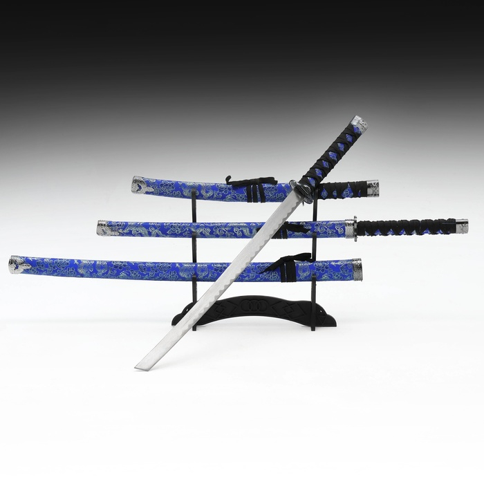 Сув. изделие катаны 3в1 на подставке, ножны ткань, драконы золото на синем 47/70/89см