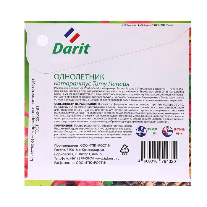 Уникальная расцветка. Высота растения 25-35 см, ширина куста 15-20 см. Цветки крупные 5-6 см, имеют идеальную круглую форму без просветов между лепестками. Цвета ярче при повышенной температуре и хорошем освещении. Обильно цветёт в тёплое и жаркое лето при условии регулярного полива (особенно в засуху). С образованием цветков и новых листьев, катарантус подкармливают специальным удобрением для декоративно-цветущих растений. Применение: Быстро разрастается, образуя плотный ковер. Высаженный вдоль дорожек катарантус становится украшением сада. Соседство с петунией или лобелией дополняет красоту растения, а гармоничное сочетание окраски цветков позволит создать на клумбе оригинальную живую композицию.