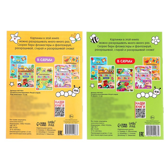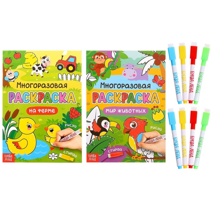 Раскраска многоразовая набор «Рисуй-стирай. Мир животных» 2 шт. по 12 стр.