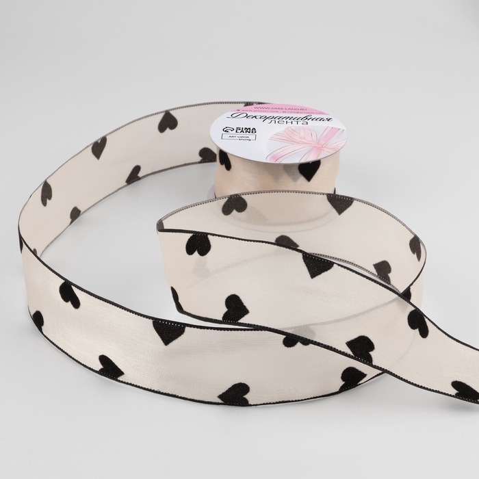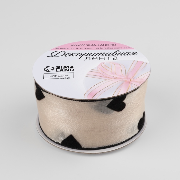 Лента капроновая «Сердечки», с бархатным тиснением, 25 мм × 9,1 ± 0,5 м, цвет бежевый/чёрный