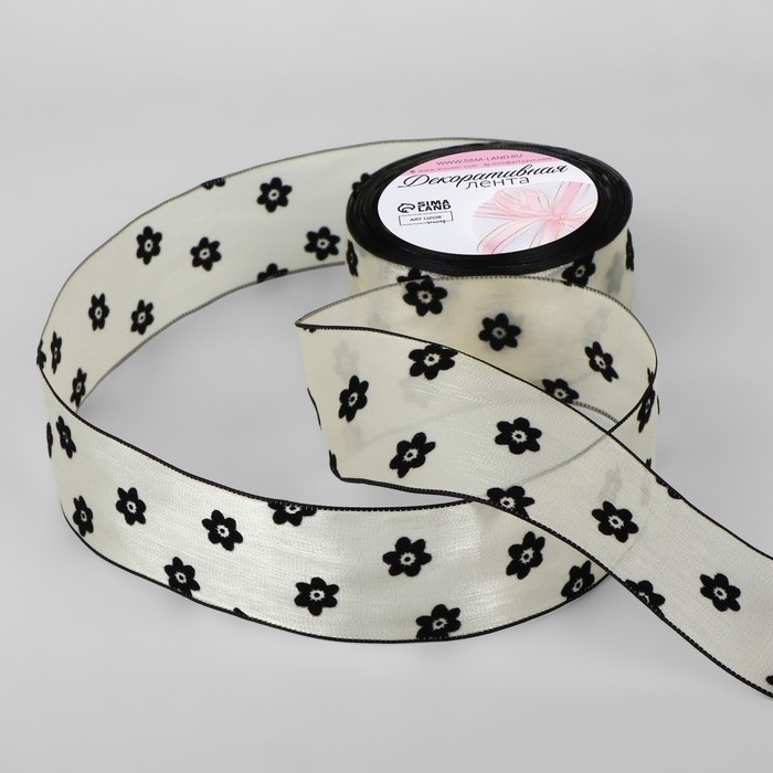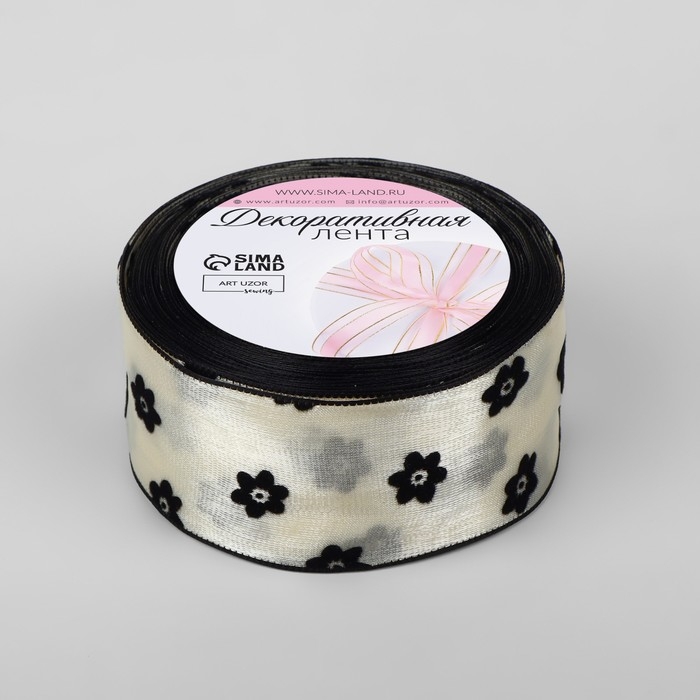 Лента капроновая «Цветы», с бархатным тиснением, 38 мм × 9,1 ± 0,5 м, цвет бежевый/чёрный