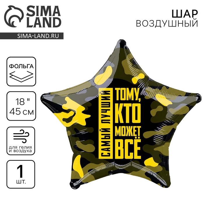 Фольгированный шар в виде звезды с надписями: «Самый лучший» и «Тому, кто может всё» можно использовать в качестве дополнения к подарку любимому мужчине, парню или мальчику. Оформление в стиле камуфляжа подходит для оформления помещения для празднования Дня защитника Отечества.