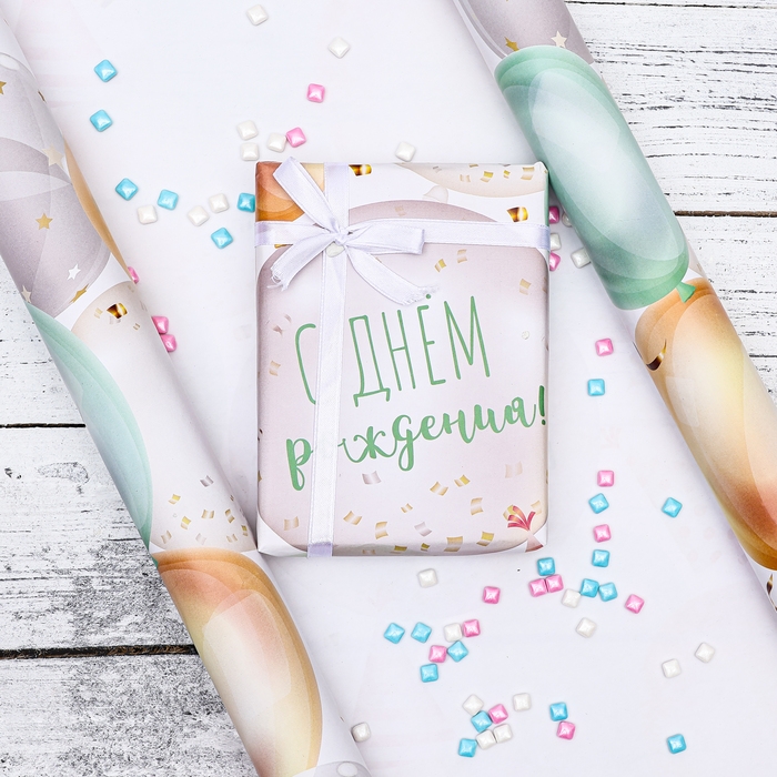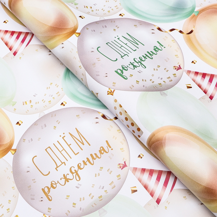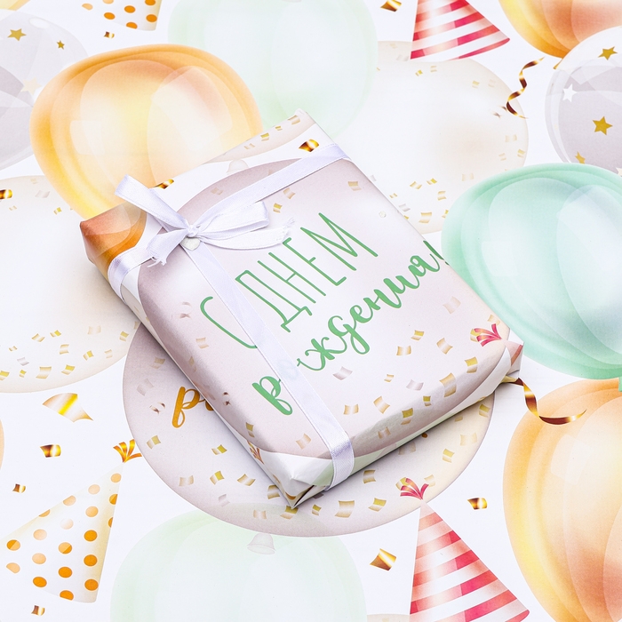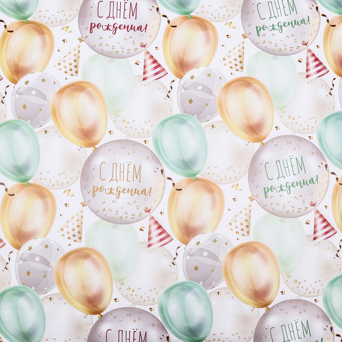 Бумага упаковочная, глянцевая "С днем рождения", подарки с шариками, 70 х 100 см, 1 лист