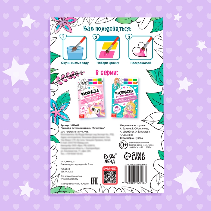 Раскраска акварельная «Антистресс», с сухими красками и кисточкой, 3+