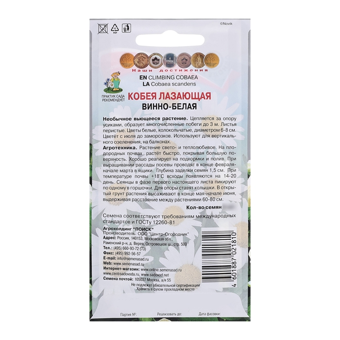 Необычное вьющееся растение. Цепляется за опору усиками, образует многочисленные побеги до 3 м. Листья перистые. Цветы белые, колокольчатые, диаметром 6-8 см. Цветет с июля до заморозков. Используют для вертикального озеленения, на балконах.Агротехника. Растение свето- и теплолюбивое. На плодородных почвах растет быстро, покрывая большую поверхность. Хорошо реагирует на подкормки и полив. При выращивании рассады посевы проводят в конце февраля - начале марта в ящики. Глубина заделки семян 1,5 см. При температуре почвы +18 °C всходы появляются на 14-20 день. Сеянцы в фазе первого настоящего листа пикируют по одному в горшочки. Для опоры ставят колышки. В открытый грунт растения высаживают в конце мая-начале июня, выдерживая расстояние между растениями 60-80 см.Семена соответствуют требованиям международных стандартов и ГОСТу РФ 12260-81.