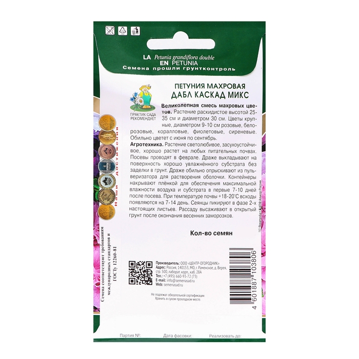 Великолепная смесь махровых цветов. Растение раскидистое высотой 25-35 см и диаметром 30 см. Цветы крупные, диаметром 9-10 см розовые, бело-розовые, коралловые, фиолетовые, сиреневые. Обильно цветет с июня по сентябрь.Агротехника. Растение светолюбивое, засухоустойчивое, хорошо растет на любых питательных, почвогрунтах. Посев семян на рассаду проводят в феврале-марте. Семена слегка вдавливают в почву, землей не присыпают. Посадочную емкость накрывают стеклом и ставят в освещенное место. При температуре почвы +18-20°С всходы появляются на 14-20 день. Сеянцы пикируют в фазе 2-х настоящих листьев. Рассаду высаживают в открытый грунт после окончания весенних заморозков.Семена соответствуют требованиям международных стандартов и ГОСТу РФ 12260-81