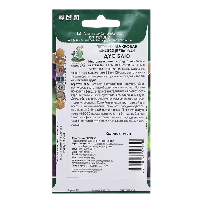 Многоцветковый гибрид с обильным цветением. Раскидистый кустик высотой 25-35 см. Небольшие аккуратные листочки с обилием махровых цветков, с сильно гофрированными лепестками, диаметром 5-6 см, яркого синего цвета. Обильно цветет с июня по сентябрь.Агротехника. Растение светолюбивое, засухоустойчивое, хорошо растет на любых питательных почвах. Посев семян на рассаду проводят в феврале-марте. Семена слегка вдавливают в почву, землей не присыпают. Посадочную емкость накрывают стеклом и ставят в освещенное место. При температуре почвы +18-20°C всходы появляются на 14-20 день. Сеянцы пикируют в фазе 2-х настоящих листьев. Рассаду высаживают в открытый грунт после окончания весенних заморозков.Семена соответствуют требованиям международных стандартов и ГОСТу РФ 12260-81
