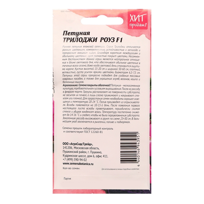 Ранняя петуния японской селекции. Серия Трилоджи отличается ранним цветением, компактностью, устойчивостью к непогоде и прекрасным внешним видом. Благодаря коротким междоузлиям и обильному цветению куст полностью покрыт цветами._x005F_x000B_Несомненным достоинством данной серии является нейтральное отношение к длине светового дня, что обеспечивает обильное цветение в течение всего сезона, даже когда световой день становится ощутимо короче. Кустик высотой 15-20 см и шириной 50-60 см, плотный, ветвистый, густо усыпан яркими цветками, диаметром 6,5 – 7,5 см. Эффектная смесь состоит из двух расцветок, прекрасно сочетающихся друг с другом, насыщенно голубо-синей и снежно белой. Петунии этой серии прекрасно подходят для создания массовых ковровых посадок, а также для украшения клумб, вазонов, кашпо и балконных ящиков. Агротехника: Семена покрыты оболочкой! Петуния – мелкосемянная культура, требовательная к условиям выращивания. Посев на рассаду в феврале-марте. Гранулы располагают на поверхности субстрата, не засыпая их почвой, а лишь слегка прижимают и накрывают стеклом или пленкой. Для прорастания семян необходимо хорошее освещение и температура 20-24˚С. Полив производят из опрыскивателя. Всходы появляются на 10-15 день. После появления первого настоящего листа всходы проветривают, периодически снимая стекло и убирая конденсат влаги. Температуру постепенно снижают до 14-16˚С и следят, чтобы не было переувлажнения субстрата. Закаленную рассаду высаживают в грунт по схеме 15×20 см. В дальнейшем уход заключается в рыхлении, поливе и подкормах. Штрих-код -