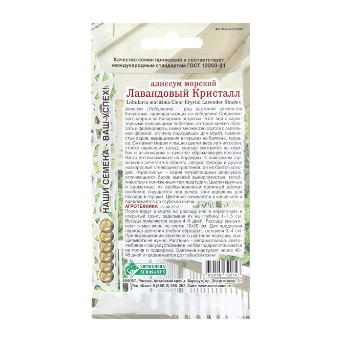 Семена цветов Алиссум морской "Лавандовый Кристалл", 0,02 г
