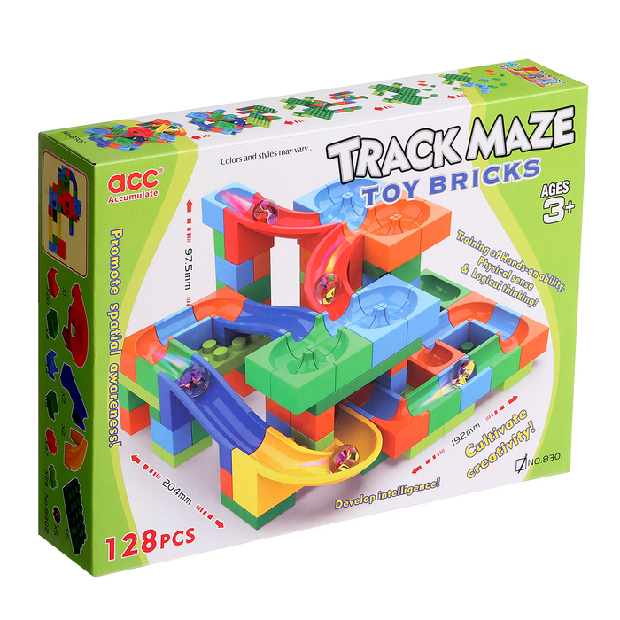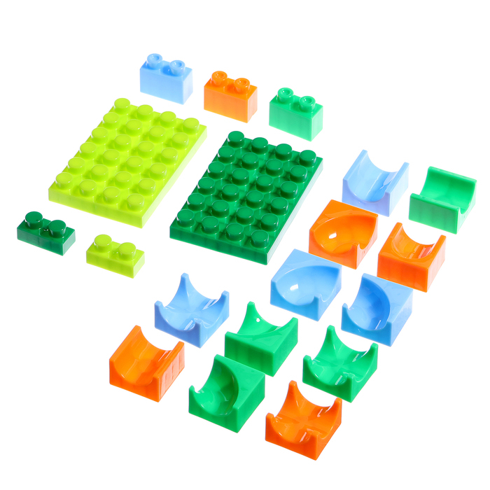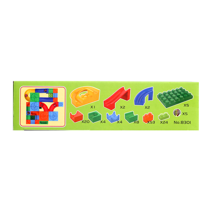 Набор состоит блочных элементов, разноцветных мостиков и извилистых дорожек. Малыш без труда соорудит трассу любой длины и сложности и будет следить за перемещениями шариков.
