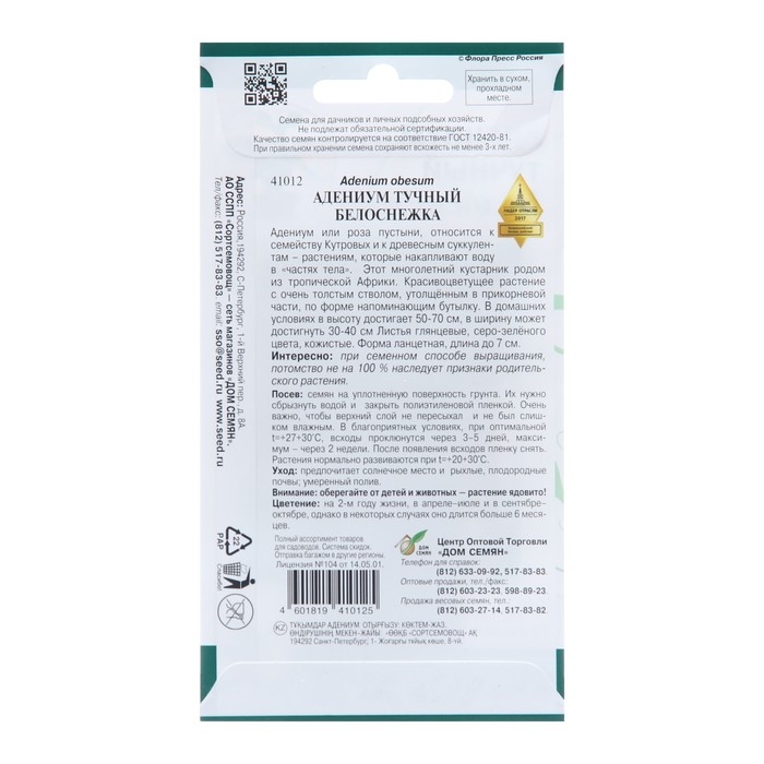 Семена цветов Адениум тучный "Белоснежка", 3 шт