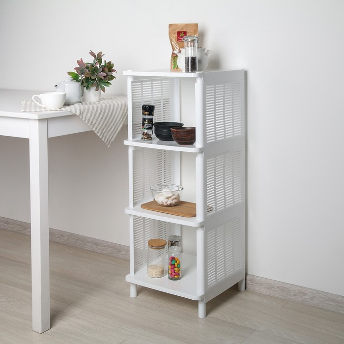 Прочный пластмассовый корпус стеллажа выдерживает высокую нагрузку. Удобная, компактная, но в то же время вместительная, этажерка прекрасно впишется в пространство любого помещения. Изделие можно расположить на кухне, в прихожей, ванной, гостиной, детской или спальне.