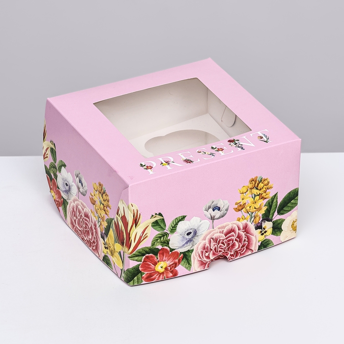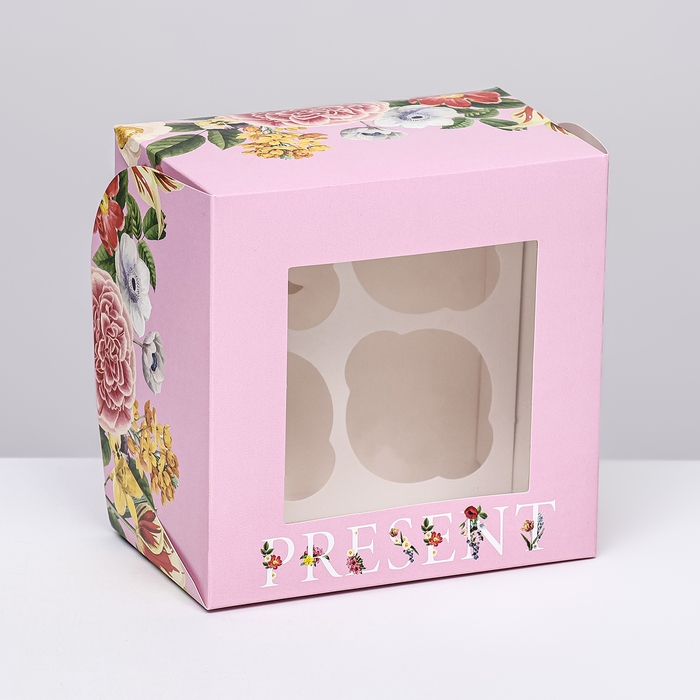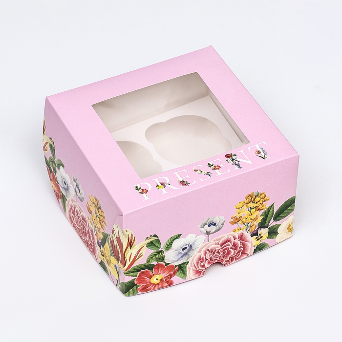 Коробка для 4 капкейков с окном , "Презент", 16 х 16 х 10 см