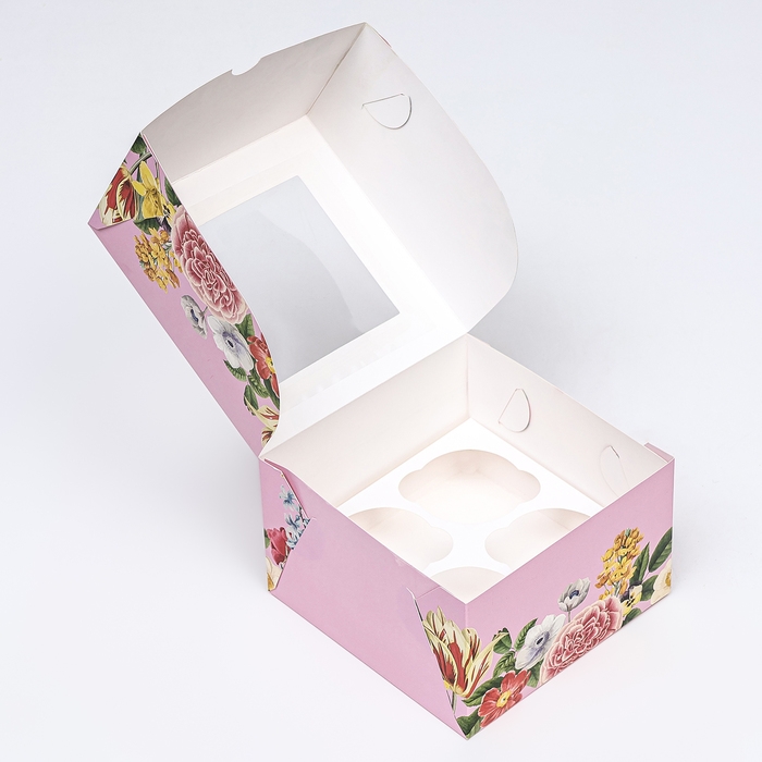 Коробка для 4 капкейка с прозрачной крышкой, "Тюльпаны", 16 × 16 × 10 см, кондитерская упаковка