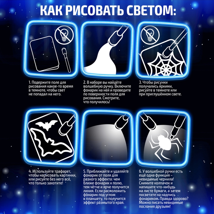 Набор для рисования светом — это отличная возможность развить творческие способности и фантазию ребёнка! С помощью специальной ручки малыш научится рисовать светом, будет создавать картинки, используя трафареты, или придумает собственные сюжеты.