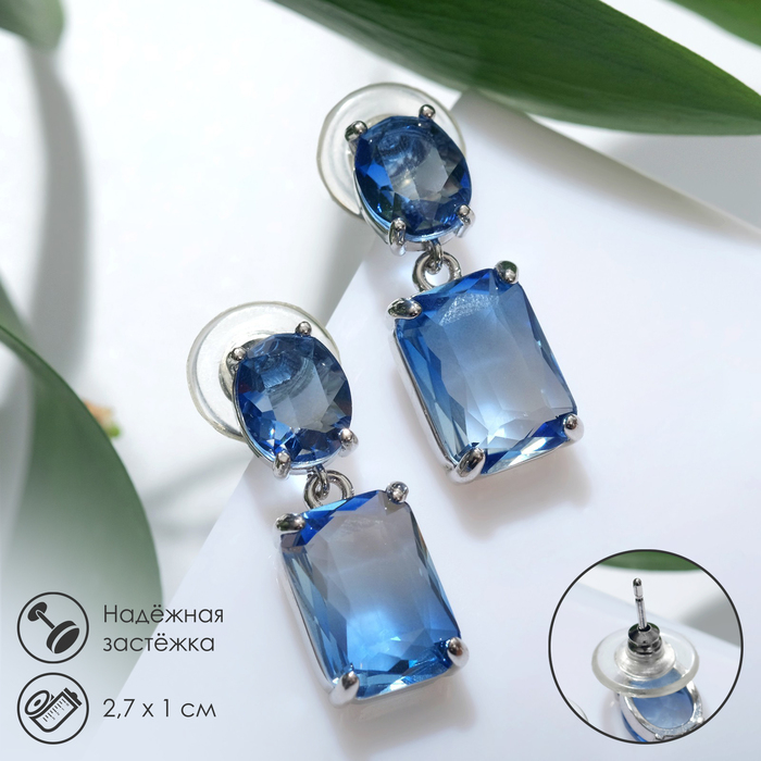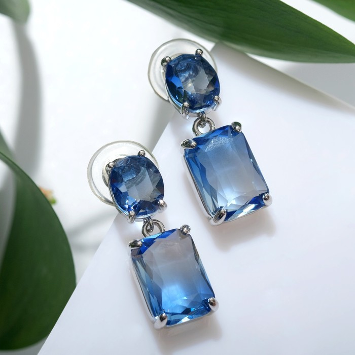 Серьги со стразами «Весна» овал квадрат, цвет синий в серебре