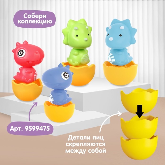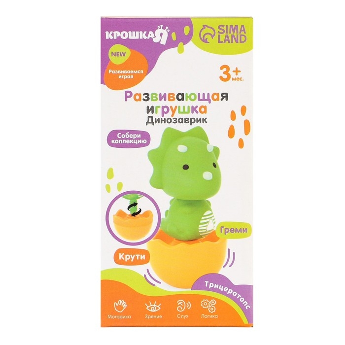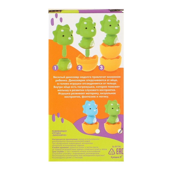 Веселый динозавр надолго привлечет внимание ребенка. Динозаврик откручивается от яйца, а голова игрушки отсоединяется от тельца. Внутри яйца есть погремушка, которая поможет малышу в развитии слухового восприятия. Игрушка развивает моторику, визуальное восприятие, фонтозию и логику.