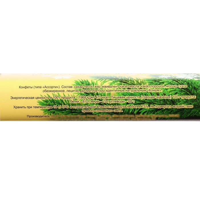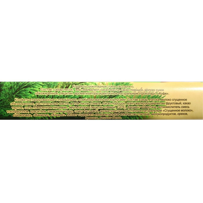 - конфеты (типа «ассорти»). Состав: сахар-песок, жир эквивалент какао-масла, какао-порошок, молоко сухое обезжиренное, лецитин, ароматизаторы идентичные натуральным «коньяк».