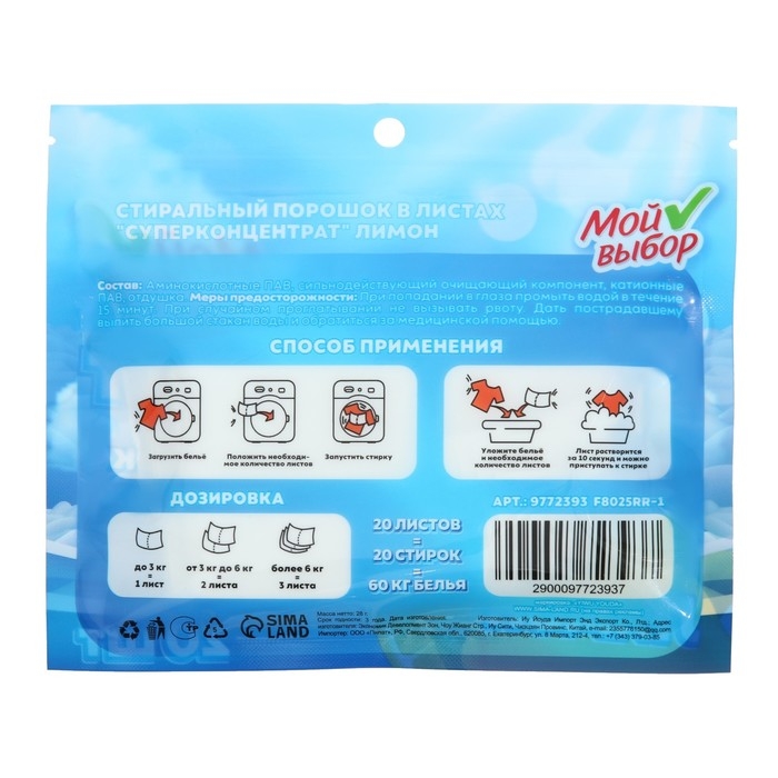 Упаковка содержит 20 листов, что обеспечит длительное использование. Стиральный порошок в листах "Мой выбор" - это надежный помощник в уходе за вашими вещами. Он обеспечивает чистоту и свежесть, а также сохраняет первоначальный вид и качество тканей.