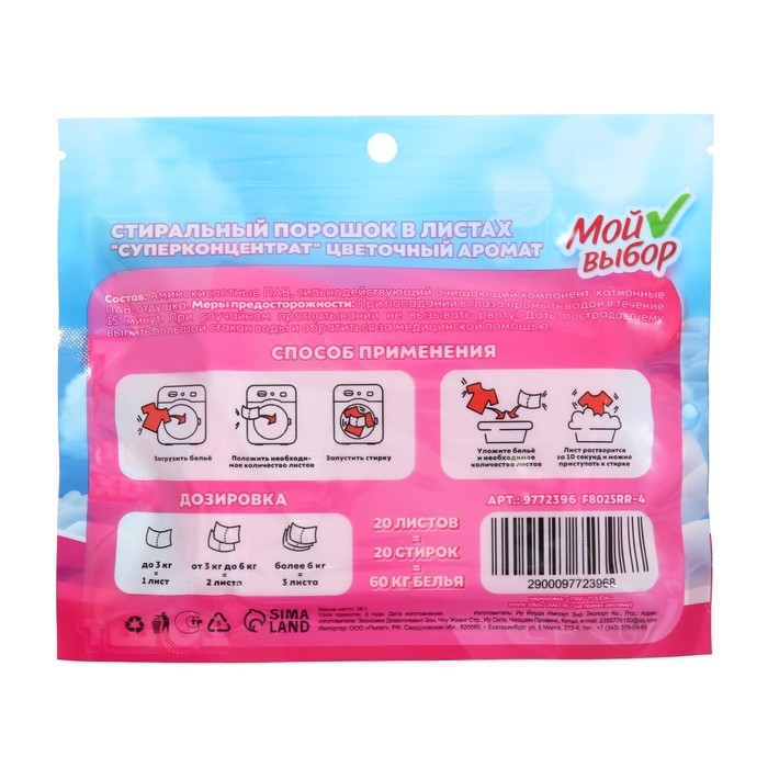Стиральный порошок в листах, Мой Выбор, Универсальный, Цветочный аромат, Концентрат, 20 листов