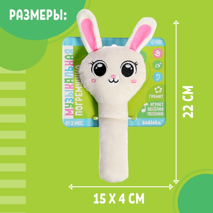 Музыкальная погремушка в виде милого кролика привлечёт внимание трогательным дизайном и надолго займёт малыша. Игрушка не только развлечёт ребёнка — с ней кроха потренирует слуховое восприятие, тактильные ощущения и зрительно-моторную координацию.