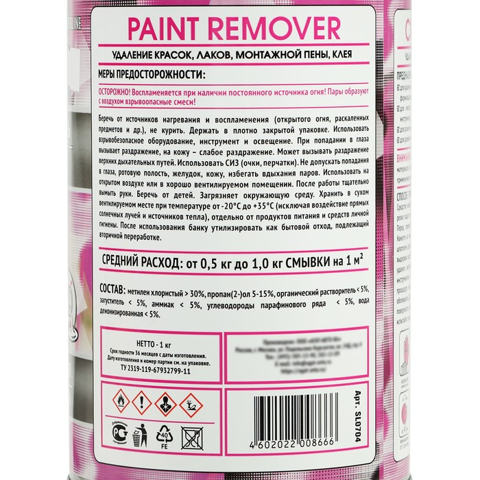 Предназначается для удаления широкой гаммы лакокрасочных покрытий: масляных, алкидных, формальдегидных, виниловых, нитроцеллюлозных и др.; для очистки от монтажной пены (жидкой и отвердевшей) строительного и др. инструмента; для размягчения и удаления застарелой монтажной пены с любых конструкций (изделий). Применяется на изделиях из металла, дерева, бетона, керамики и др. материалов (пластмассы – в зависимости от структурообразующего полимера). Перед применением рекомендуется проверить стойкость материала.
