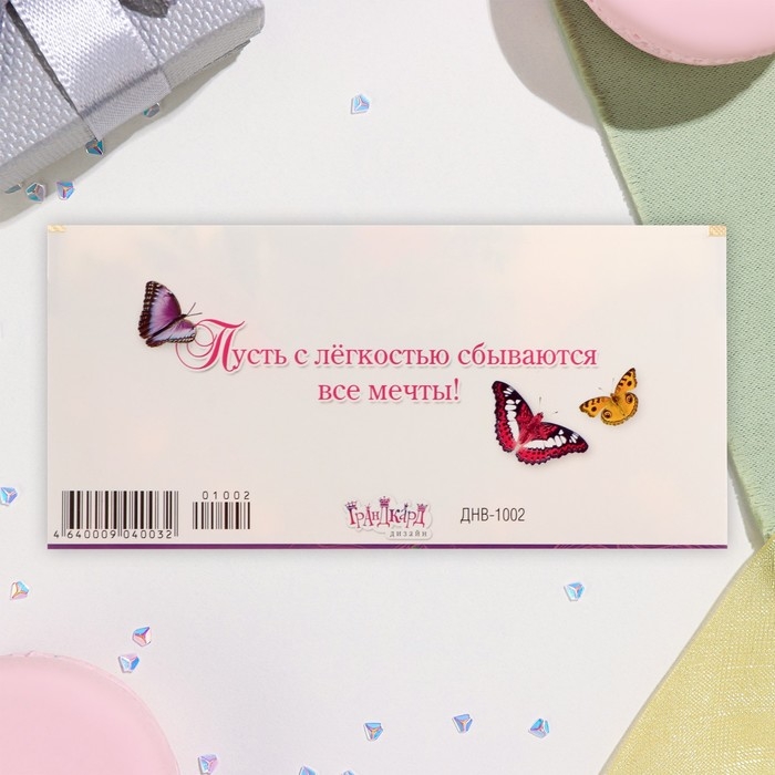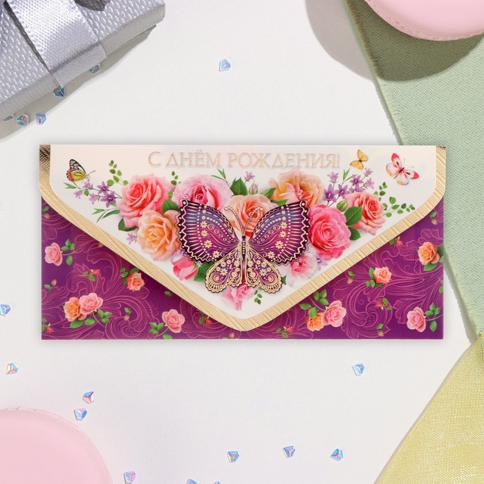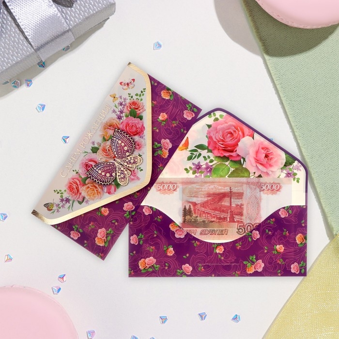 Конверт для денег "С Днём Рождения!" глиттер, тиснение, розы, 19х9,2 см