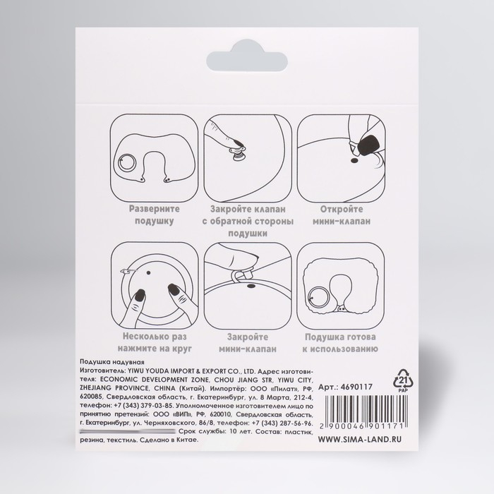 Подушка для шеи дорожная, надувная, с насосом, 47 × 27 см, цвет МИКСУдалила картонная коробка,