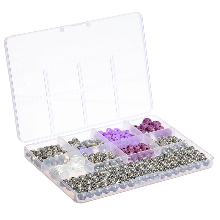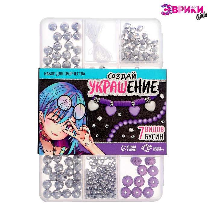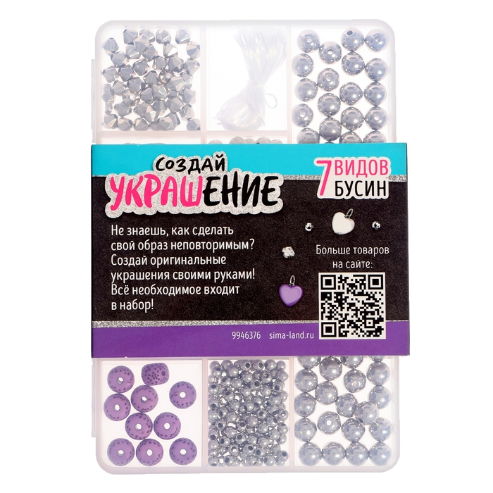 В наборе вы найдёте бусины разных цветов и размеров, подвески и нитки. Все элементы находятся в прочной пластиковой коробочке.