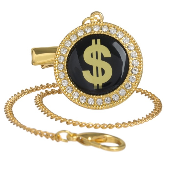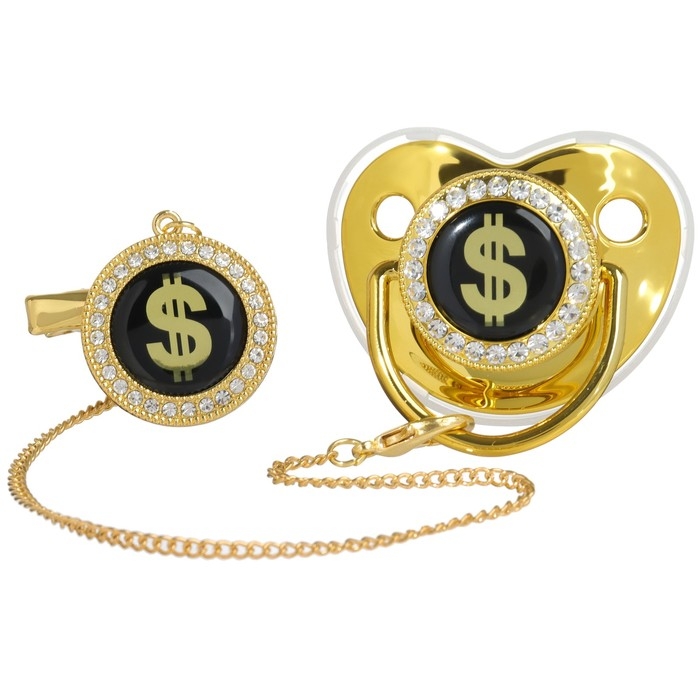 Соска - пустышка силиконовая ортодонтическая «Доллар», от 6 мес., с колпачком + держатель - цепочка, цвет золотой/черный, стразы