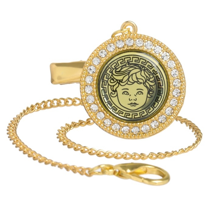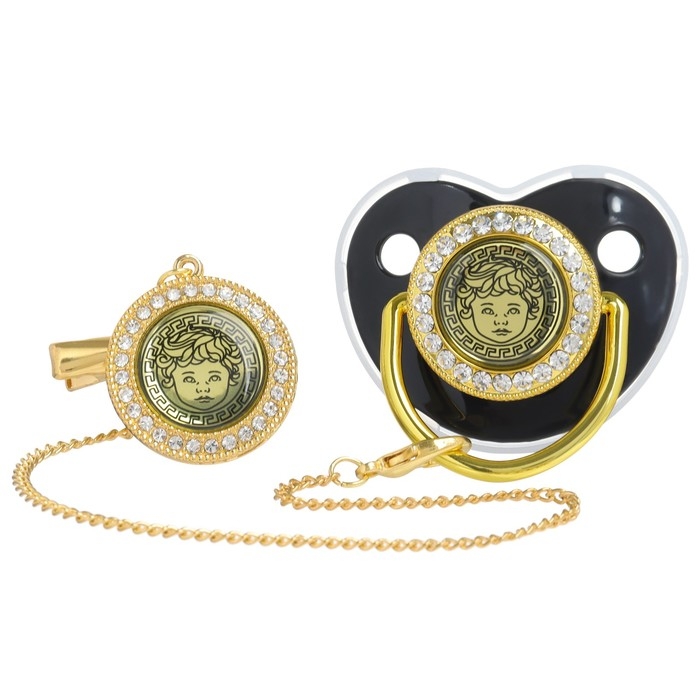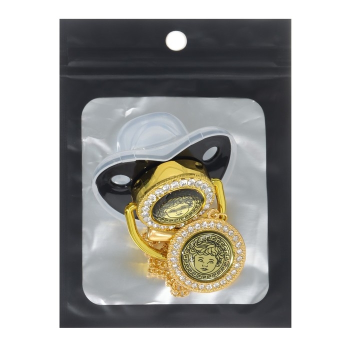 Соска - пустышка силиконовая ортодонтическая «BOSS», от 6 мес., с колпачком + держатель - цепочка, цвет черный/золото, стразы