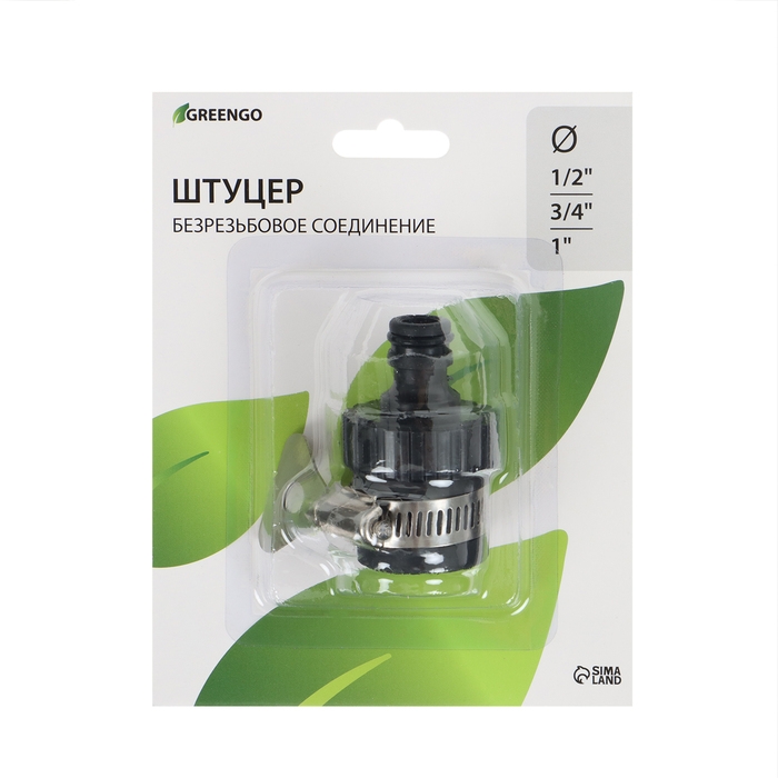 Штуцер безрезьбовой с креплением на кран, 1/2" (12 мм) - 3/4" (19 мм) - 1" (25 мм), с хомутом, быстросъёмное соединение, пластик, резина, Greengo