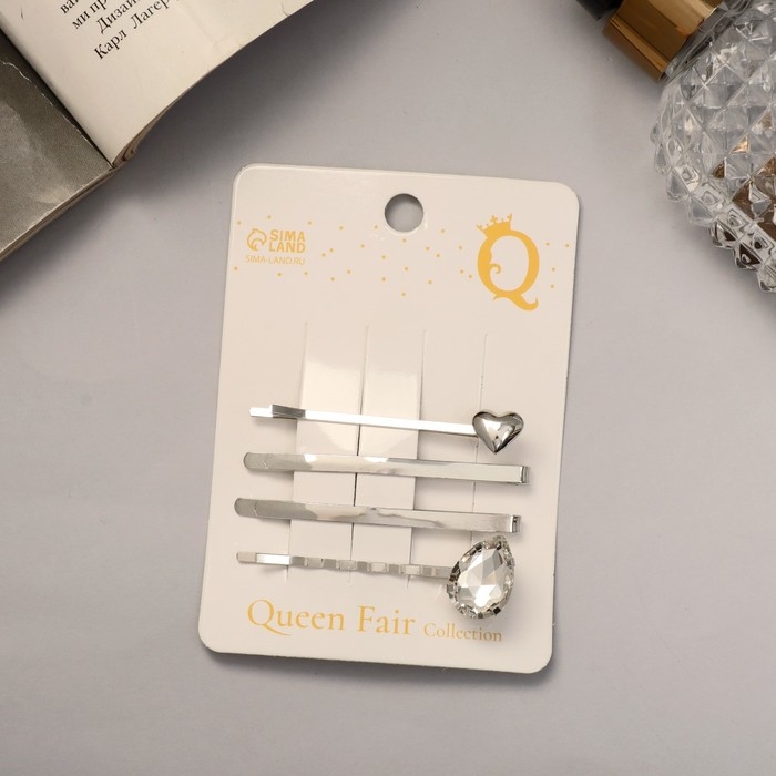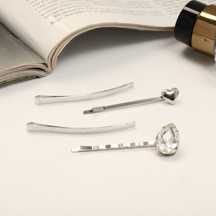 Невидимка для волос "Амелия" (набор 4 шт) сердце, 6 см, серебро