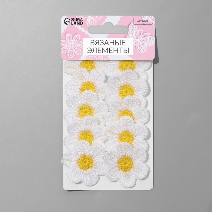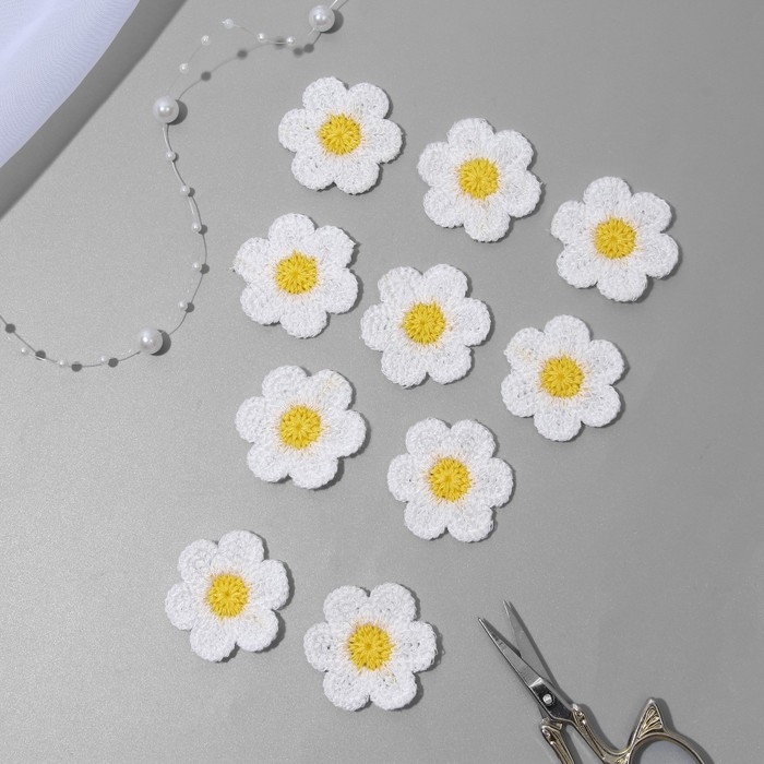 Вязаные элементы «Ромашки», 3,4 × 3,4 см, 10 шт, цвет белый/жёлтый