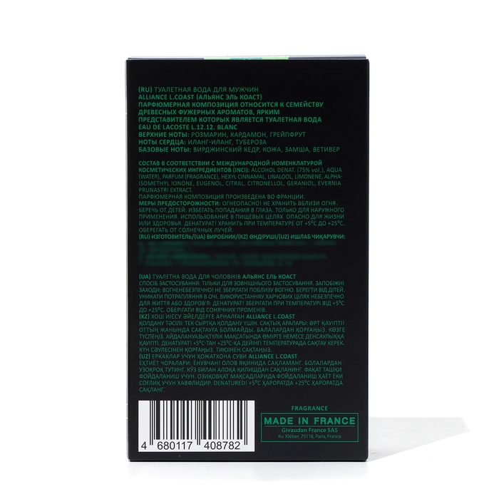 Туалетная вода мужская Alliance L.Coast, 100 мл (по мотивам Lacost 12.12 Blanc)