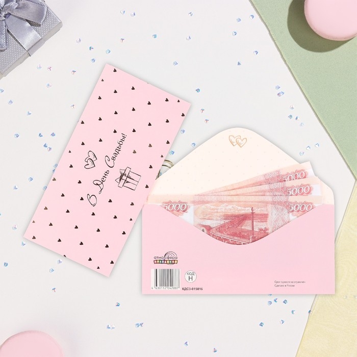 Конверт для денег "В День свадьбы" софт-тач, тиснение, розовый фон, 17х8 см