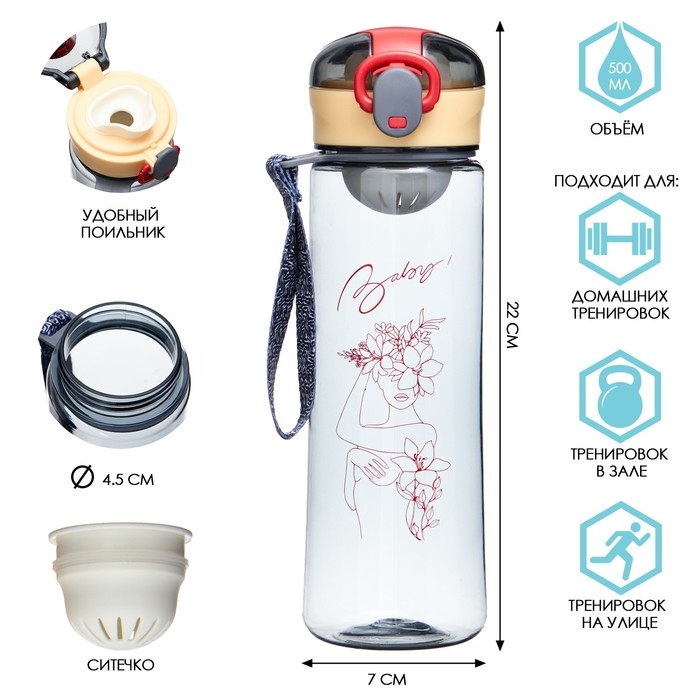 Она изготовлена из прочного и экологически чистого пластика, который не повреждается при активном использовании и позволяет сохранять воду свежей и чистой на протяжении всего дня. Бутылка оборудована герметичной крышкой с поильником и удобным ремешком, который позволяет носить ее с собой или крепить к сумке или рюкзаку. Подарите эту бутылку маме, бабушке, папе, другу, подруге, сестре на любой праздник – она станет полезным и практичным подарком для здорового образа жизни!