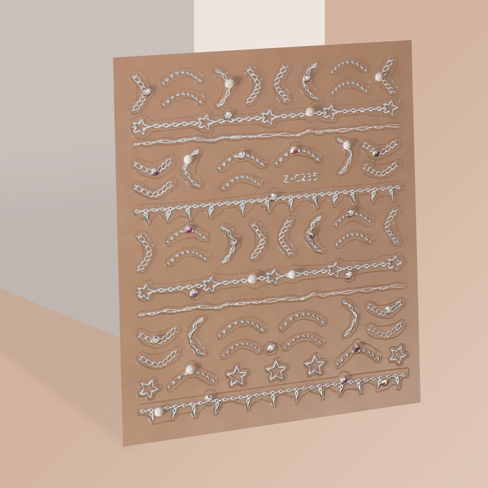 Наклейки для ногтей «Цепи», объёмные, фольгированные, со стразами и бусинами, цвет серебристый