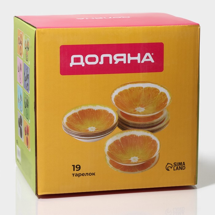 Набор тарелок стеклянных Доляна «Сладкий арбуз», 19 предметов: 6 десертных тарелок, 6 обеденных тарелок, 6 мисок, салатник